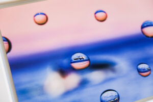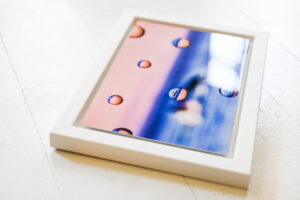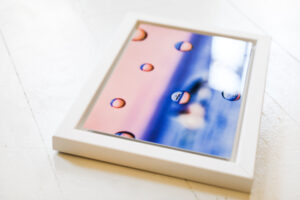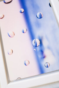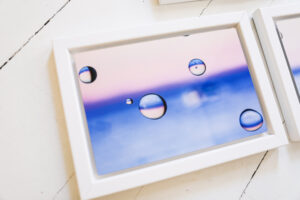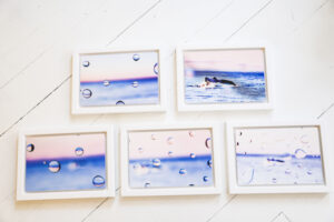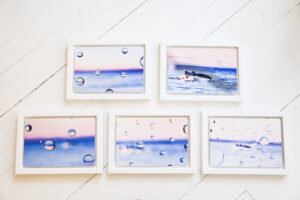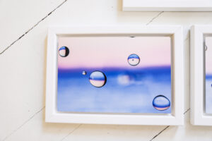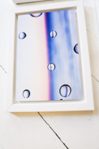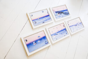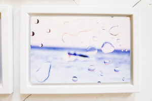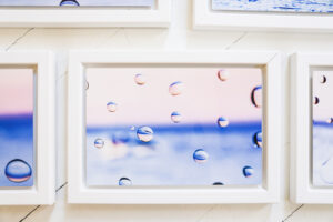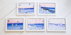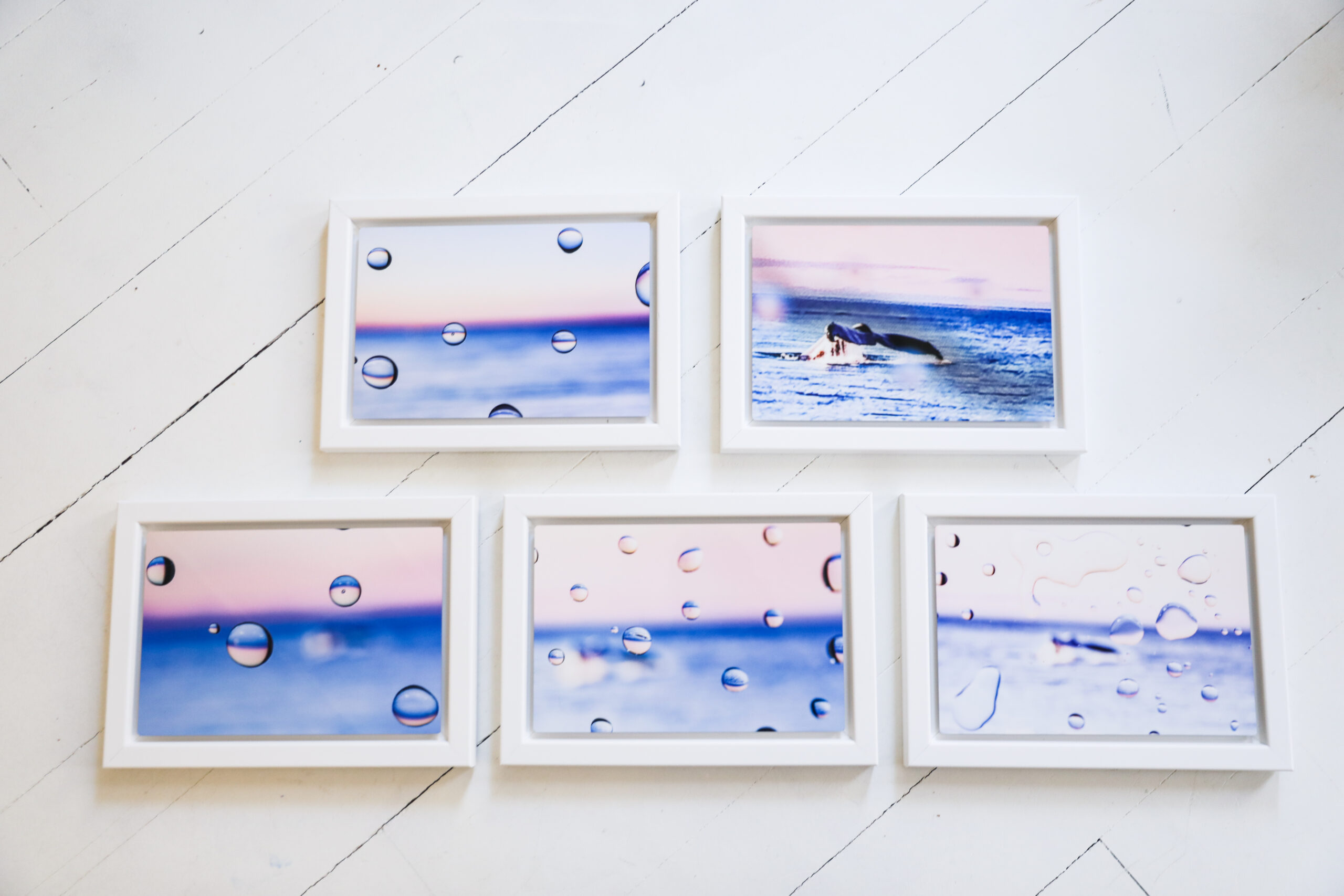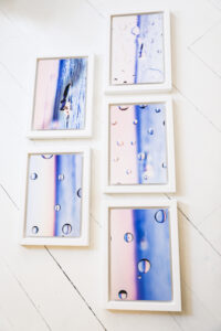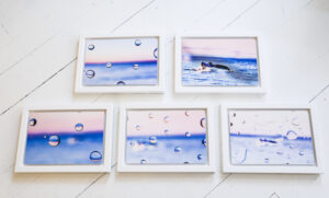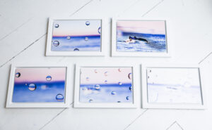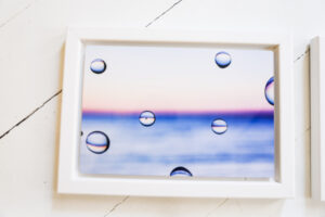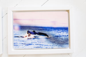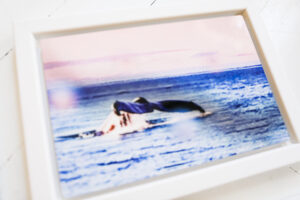 Our curiosity about the ocean is especially compelling. The whale watch is a trope for attempting to see the elusive- was that a whale we saw? Where was it? Frequent utterances and frustration whalewatching are reflected in the first series through the spatter of salty ocean water. This features a modified photo shot on Egypt Beach where infrequent whale sightings from the shore generate a lot of interest, pointing, and where is it’s. It is framed in white wood and printed on metal